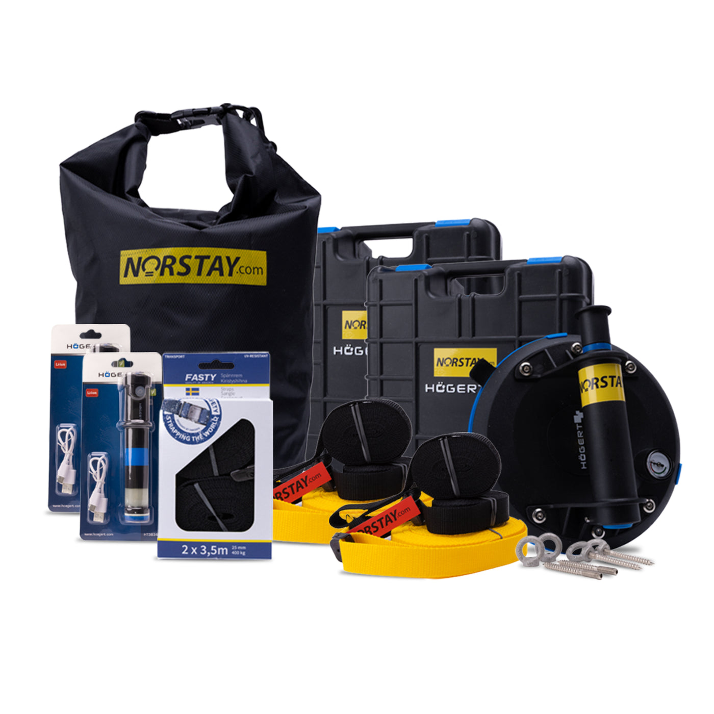 STEADY – Totalpakke får du en komplett løsning for trygg, effektiv og profesjonell sikring av stige og utstyr. Pakken kombinerer kvalitetsprodukter fra NORSTAY, Högert og FASTY, slik at du kan jobbe sikkert – uansett oppdrag.